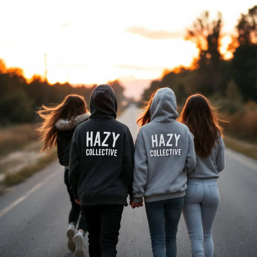 Hazy Collective slogan at the back. Walk away and watch them pay attention. Stay comfy and street with a basics coolness.